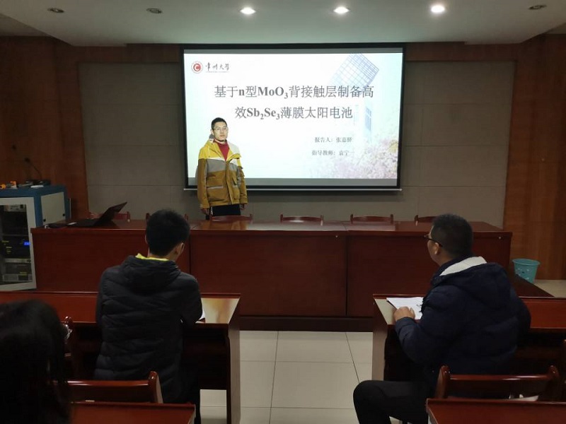 11月25日下午14:00,微电子与控制工程学院在逸夫楼516报告厅开展了2018级研究生第一次学术报告活动。王智伟、张嘉驿和朱威凯同学分别做了《氧化钨薄膜结构调控与电致变色性能研究》、《基于n型MoO3背接触层制备高效Sb2Se3薄膜太阳电池》和《多孔六边形Na3V2(PO4)2F3碳包覆微米球》的学术报告。微电子与控制工程学院研一和研二研究生参加此次报告。