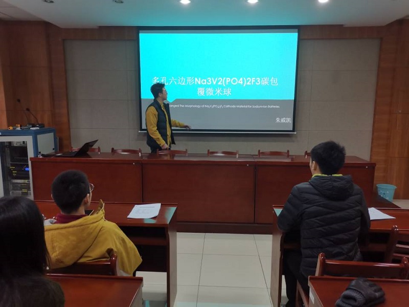 王智伟同学的研究表明通过改变WOx薄膜表面结构,增加比表面积调控薄膜的结晶度以及含氧量从而提高了着色效率,延长了寿命和缩短了响应时间,最终实现调控氧化钨薄膜结构及优化电致变色性能。张嘉驿同学通过补Se、掺杂来抑制本征深能级缺陷,构建了NIP(NPP⁺)结构,研究其他新型缓冲层材料,或在pn结界面处制备超薄插层,甚至制备同质结,来寻找有效的背接触层;通过不同基底材料来诱导Sb2Se3的生长取向尽可能沿着(001)方向,最终制备出高效Sb2Se3薄膜太阳电池。朱威凯同学采用水热法制备了Na3V2(PO4)2F3 @ C(NVMPF @ C),研究了表面活性剂(聚乙烯吡络烷酮PVP、Hexadecyl trimethyl ammonium Bromide CTAB)对钠离子电池正极材料性能的影响。通过各种表征,NVMPF @C将其性能与未处理产品进行比较,并验证适当的表面活性剂改性可以增强电子传导和钠离子扩散,从而有效地提高NVPF的性能。最后,他们都对各自近期研究的内容作了总结。
