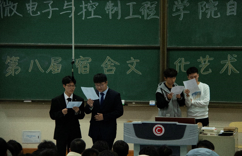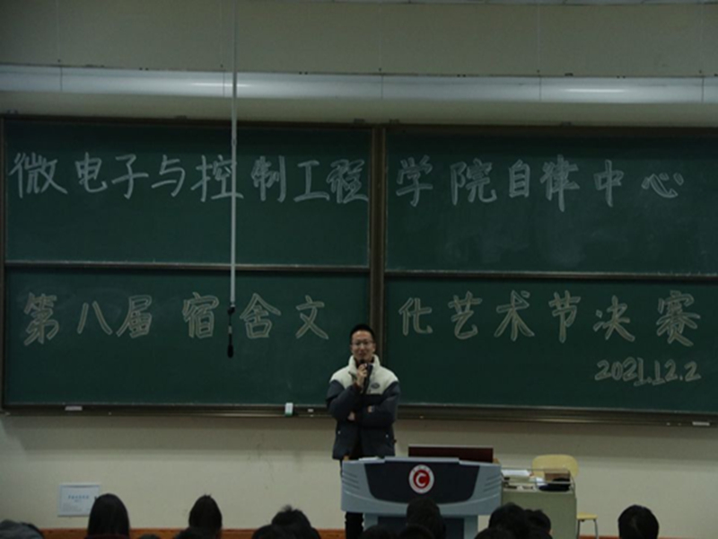 胸藏文墨怀若谷,腹有诗书气自华。为了丰富校园文化生活,增强学生卫生理念,营造弘美致德,和谐温馨的宿舍文化氛围,12月2日晚,微电子与控制工程学院在西太湖校区立德楼X1阶开展第八届“扬青春向上,沁文化熏陶”主题宿舍文化艺术节暨内务整理活动。学院新生辅导员梅颢、院自律中心主任陈杰、副主任艾佳艺和戴仕龙、各参赛宿舍成员以及全体大一新生参加。