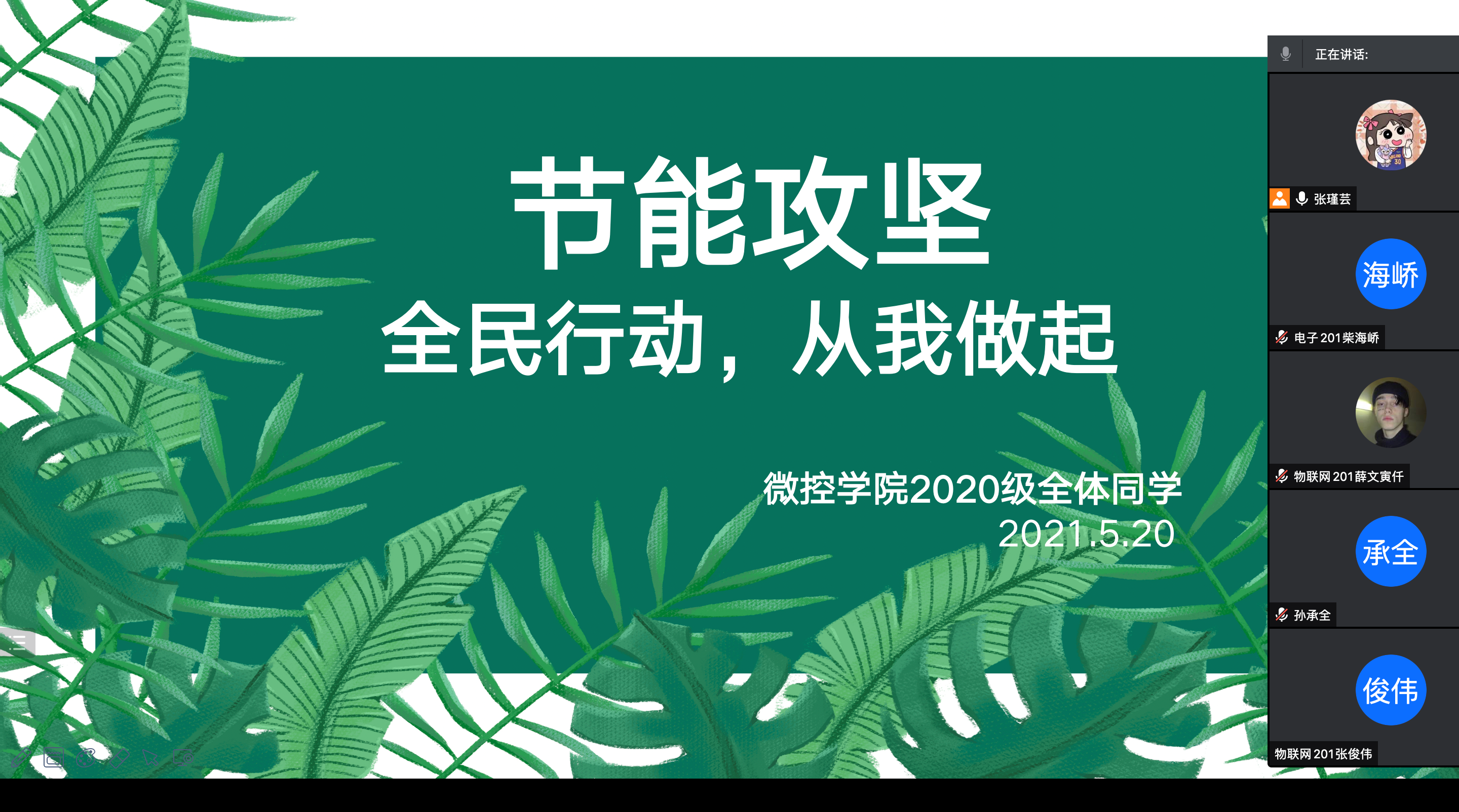 2021年5月20日,微控学院2020级开展了以“节能攻坚,全民行动,从我做起”为主题的线上节能环保主题班会。2020级全体同学参加会议,会议由物联网201班的团支书张瑾芸同学主持。
