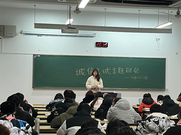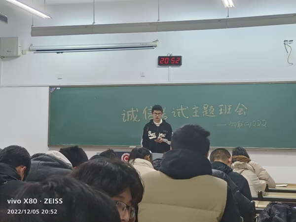 随着寒气的到来,期末考试也逐渐临近,班长强调了诚信考试的重要性,并且对签署的承诺书进行了解读,号召大家要严格按照上面要求,杜绝违规行为,做到诚信考试,诚实做人。