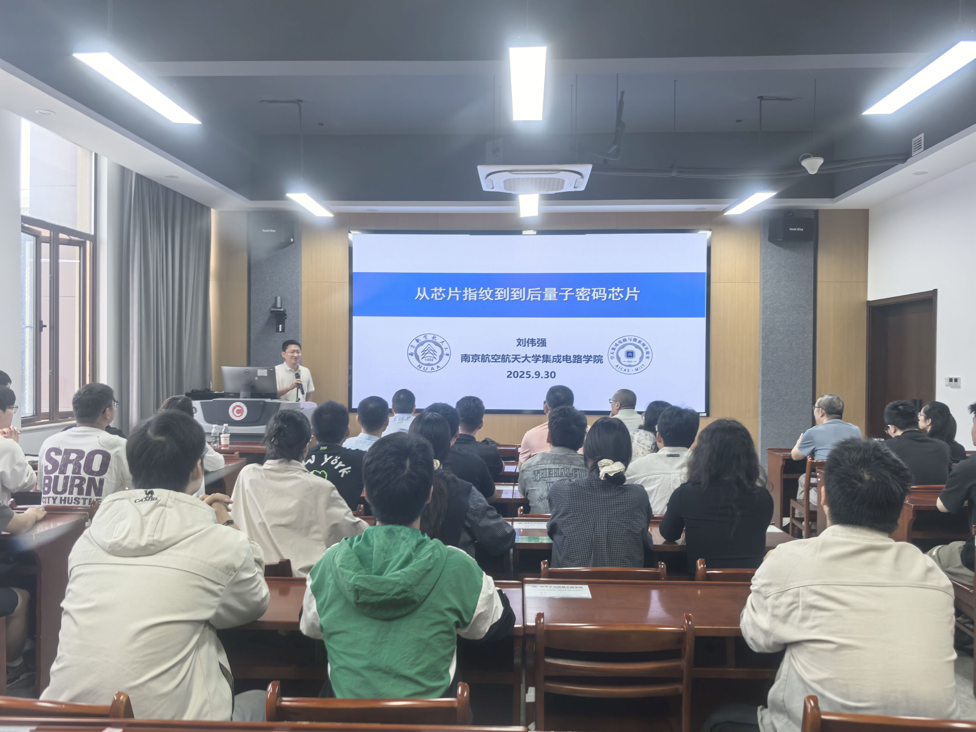 9月30日上午,我院在立功楼402举办华罗庚学术沙龙系列讲座第二讲,南京航空航天大学集成电路学院执行院长刘伟强教授应邀为我院师生作题为《从芯片指纹到后量子密码芯片》的主题讲座。学院副院长徐权主持会议。