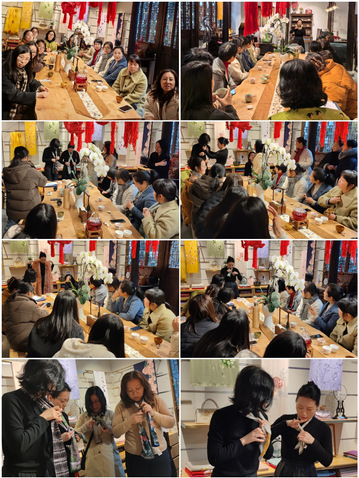 参观过后,老师们围坐在长桌前,学习各类丝巾的多种系法。老师们手拿丝巾,跟着讲解的老师一步一步操作,学到了小方巾、大方巾、长巾的多种系法。边学边分享着经验,系好后拍下美美的照片。老师们喝着茶,聊着天,分享着快乐,度过了一个愉快的下午。