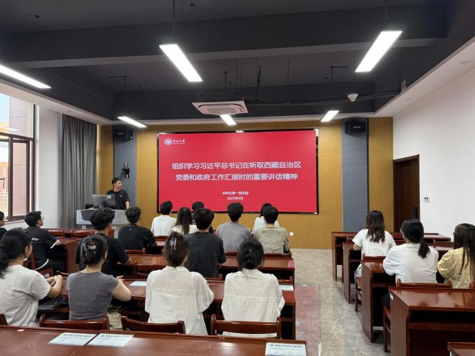 为深入学习贯彻习近平总书记在听取西藏自治区党委和政府工作汇报时发表的重要讲话精神,学院第一学生党支部于2025年9月3日在立功楼402会议室组织开展集中学习会议,由支部书记张永盈主持,全体党员参加。