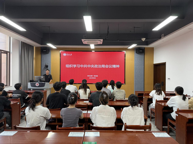 为深入学习贯彻中共中央政治局会议精神,学院第一学生党支部于2025年9月3日在立功楼402会议室组织开展集中学习,由支部书记张永盈主持,全体党员参加。